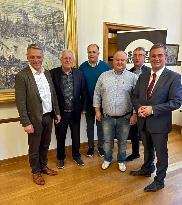 vlnr: José Debels - schepen van sport, Geert Messiaen, Kris Declercq - burgemeester, Robby Devlies en Alexander Hanssens.